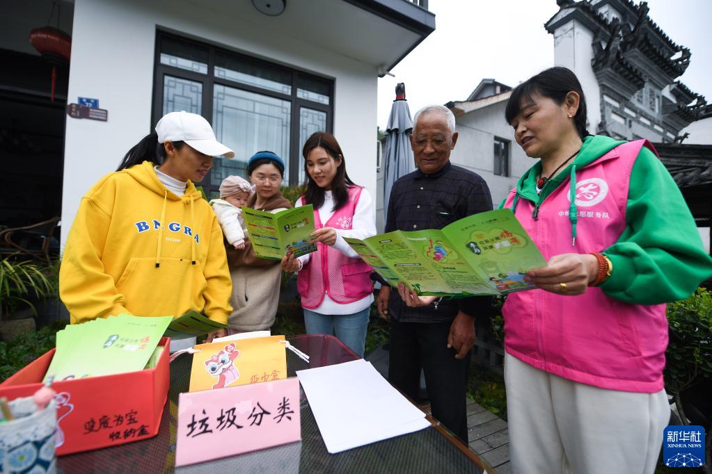 浙江杭州市臨安區湍口鎮婦聯(lián)組織黨員志愿者在庭院里給村民普及垃圾分類(lèi)知識,并介紹如何變廢為寶,用廢舊物品美化環(huán)境(2022年4月14日攝)。