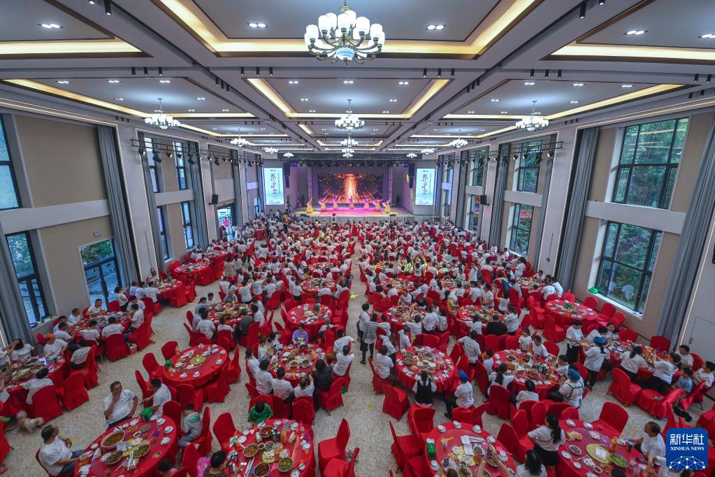 浙江建德市新安江街道梅坪村村民在村文化禮堂內參加百家宴并觀(guān)看文藝演出(5月27日攝)。
