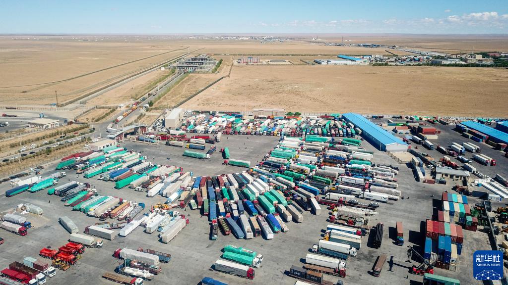 6月11日,二連浩特口岸旁的進(jìn)出口物流園區中大量貨運卡車(chē)排隊準備出關(guān)(無(wú)人機照片)。