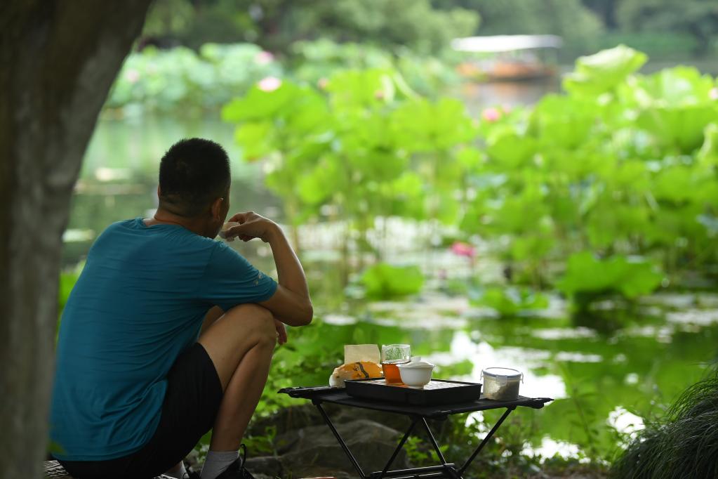 6月11日,游客在曲院風(fēng)荷景區喝茶賞荷。