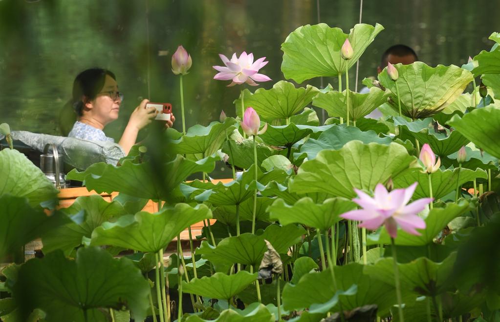 6月11日,游客在曲院風(fēng)荷景區乘船欣賞荷花。