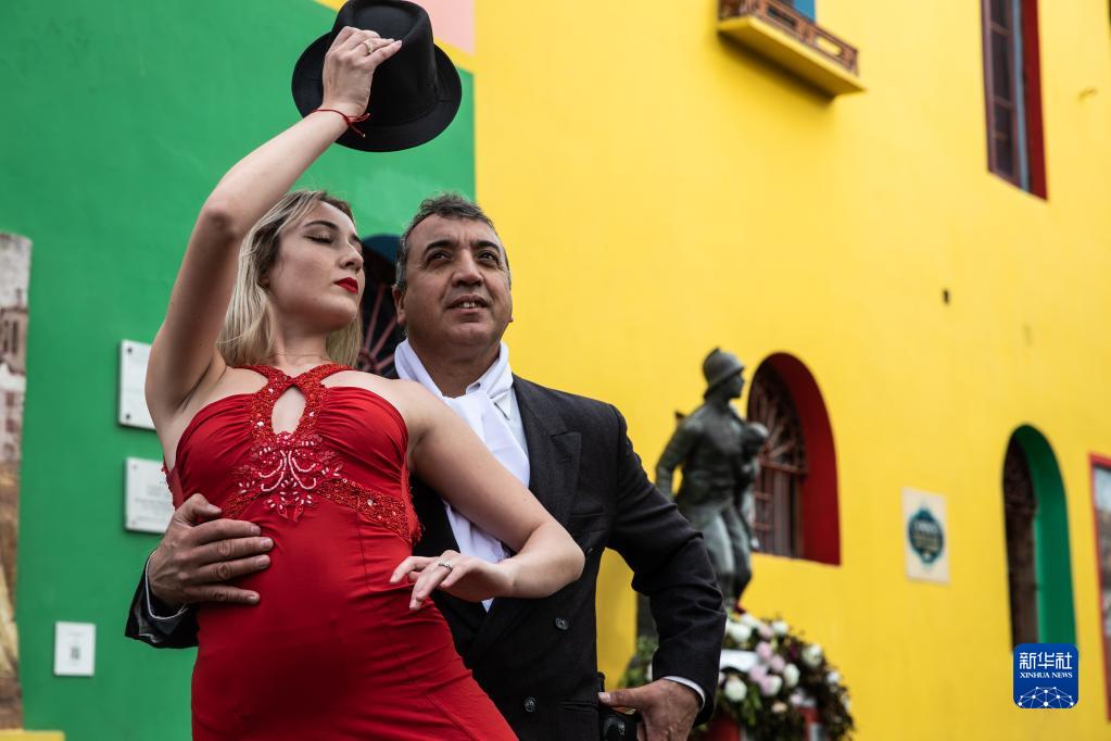 6月9日,兩名探戈舞者在阿根廷首都布宜諾斯艾利斯博卡區的街頭表演。