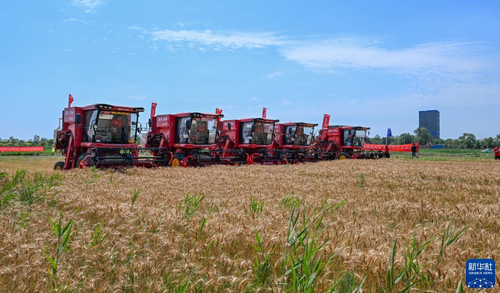 6月11日,在天津市靜海區蔡公莊鎮,多臺農機進(jìn)行小麥機收減損比賽。