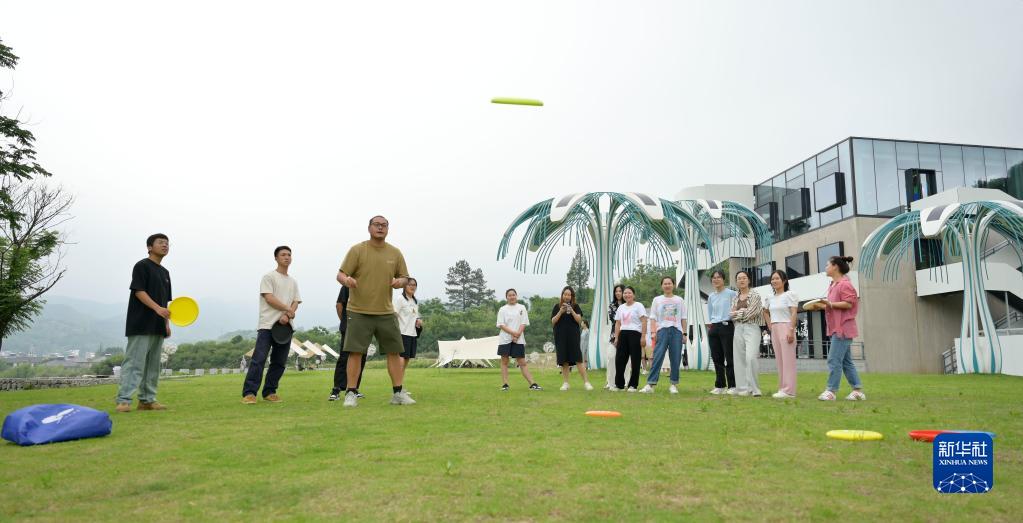 6月5日,在浙江省湖州市安吉縣天荒坪鎮余村鄉村圖書(shū)館前,年輕人在草坪上玩飛盤(pán)。