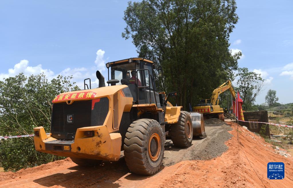 6月11日,在廣西合浦縣白沙鎮,工人在施工修復遭洪水損毀的堤壩。