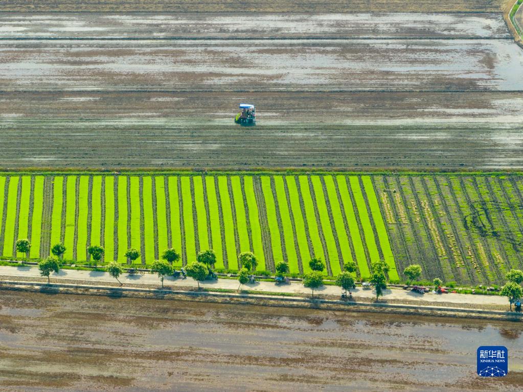 6月11日,在江蘇省興化市周莊鎮四美村,農民駕駛農機進(jìn)行插秧作業(yè)(無(wú)人機照片)。