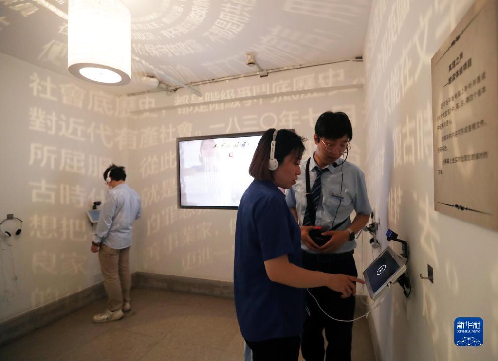 6月9日,在又新印刷所舊址內,參觀(guān)者通過(guò)智能屏互動(dòng)朗讀《共產(chǎn)黨宣言》。