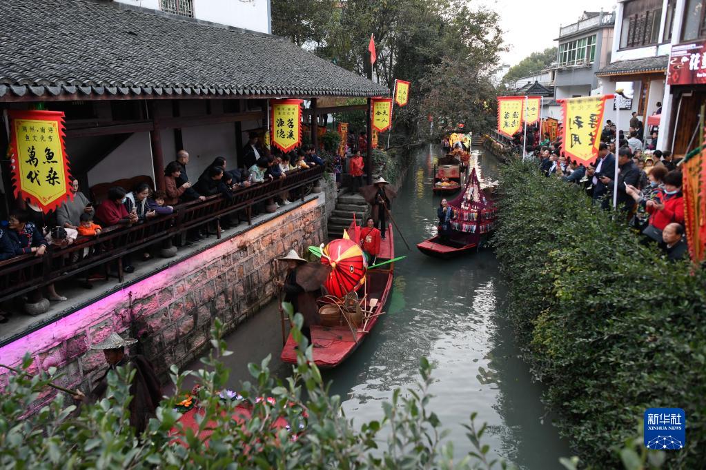 游客在浙江湖州南潯區和孚鎮荻港村觀(guān)看“水上曬秋”豐收慶典(2020年11月15日攝)。