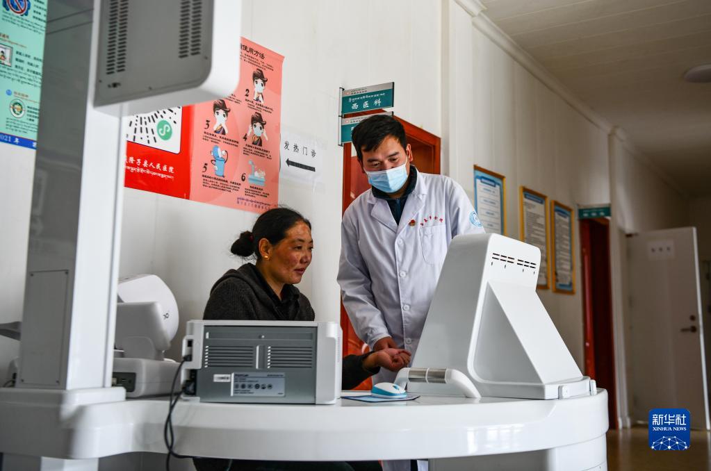 玉麥鄉衛生院院長(cháng)邱建亮(右)為玉麥居民烏金曲珍檢查身體(6月10日攝)。