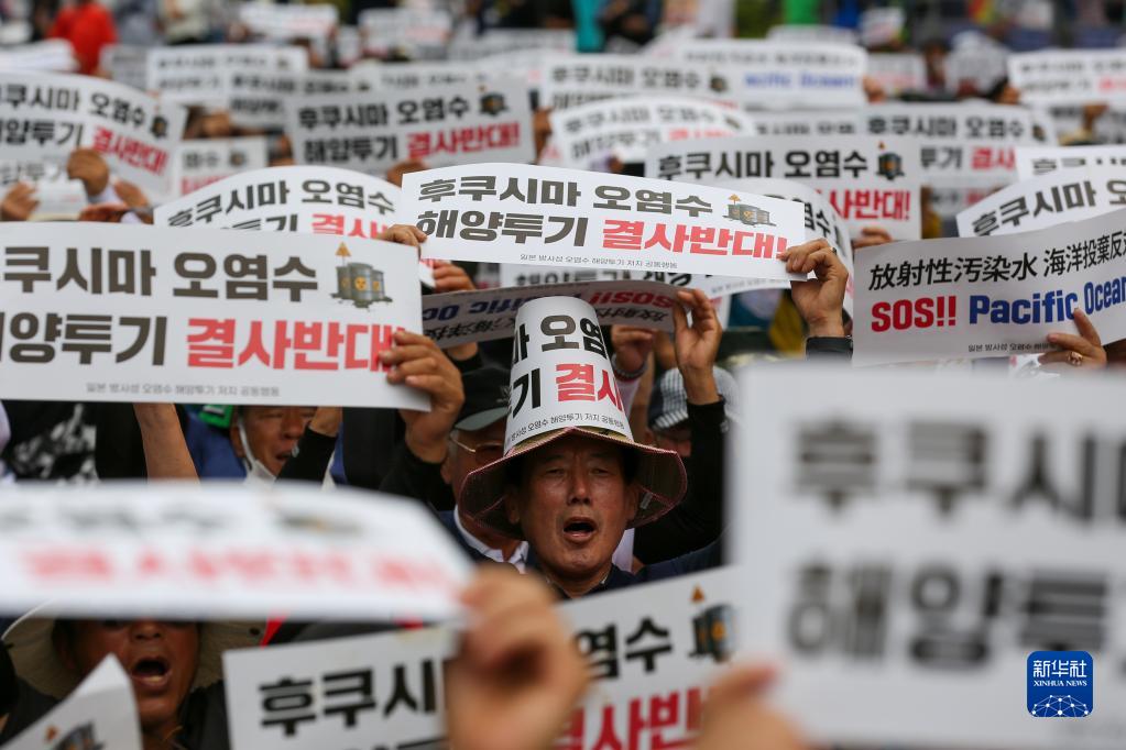 6月12日,民眾在韓國首爾手舉標語(yǔ)牌參加集會(huì ),反對日本核污染水排海。