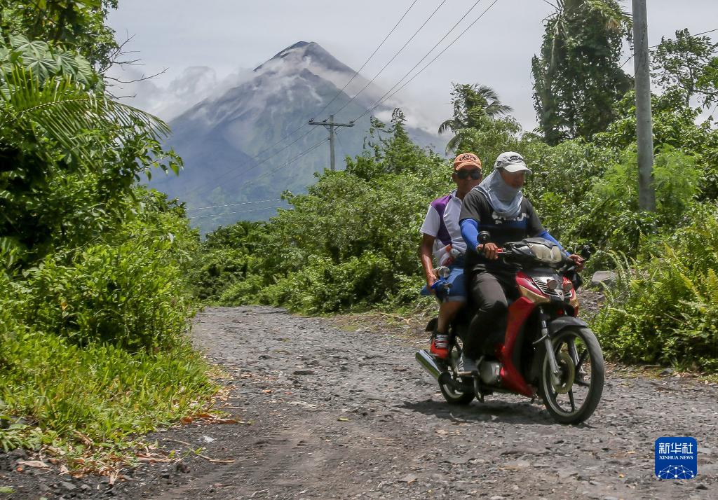 6月12日,居民在菲律賓東北部阿爾拜省的馬榮火山附近騎行。