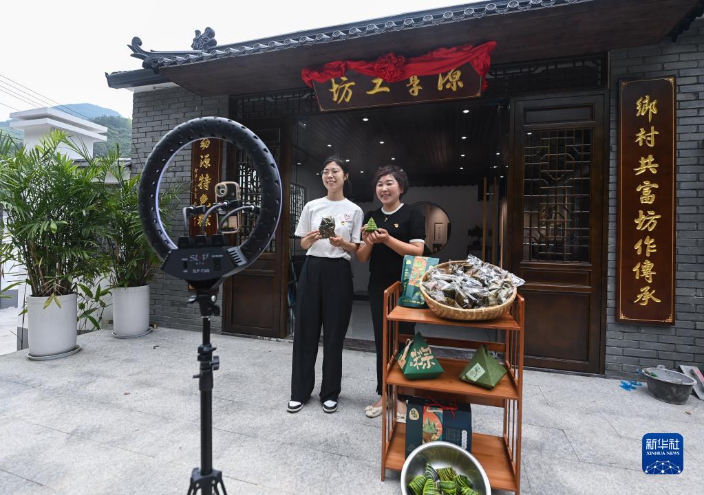 6月13日,在杭州市富陽(yáng)區湖源鄉窈口村的“源享共富工坊”的展示館外,當地黨員志愿者直播推介灰湯粽。