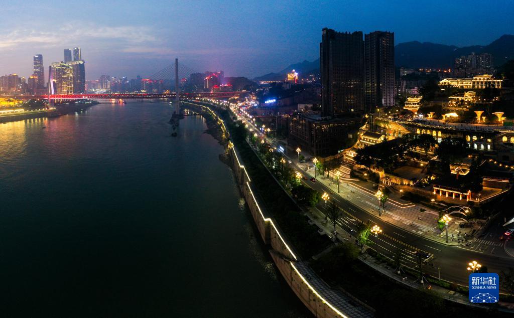 6月9日拍攝的重慶南岸區南濱路上的重慶開(kāi)埠遺址公園夜景(無(wú)人機拼接照片)。