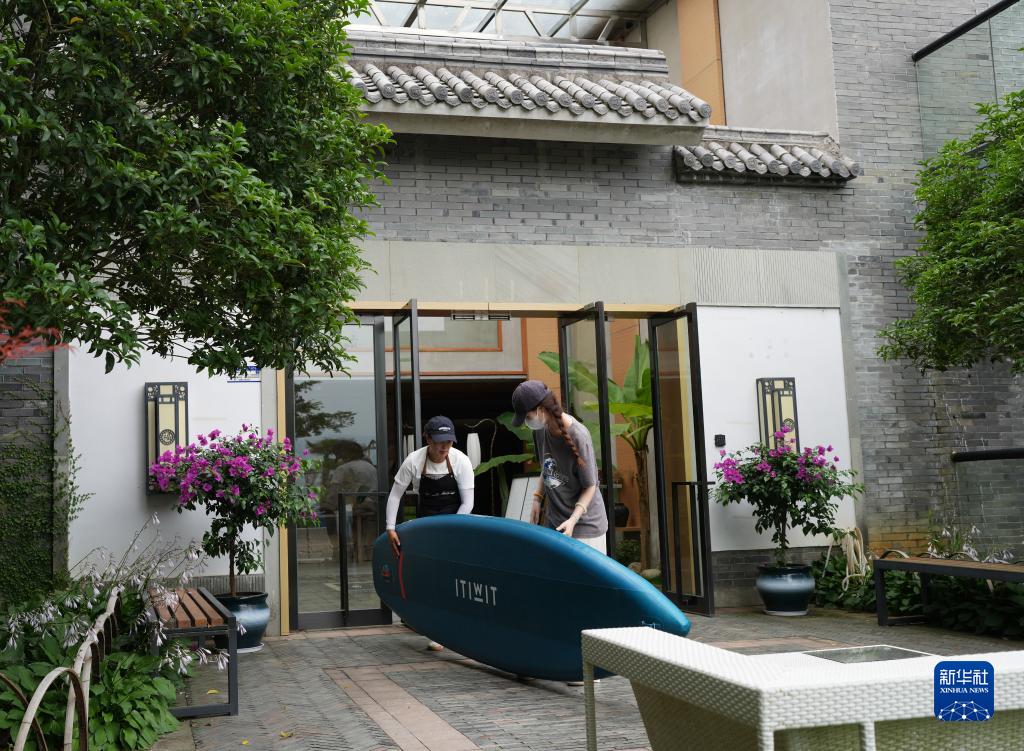 6月12日,在強蛟鎮橫山島的一家民宿,工作人員為顧客準備槳板。