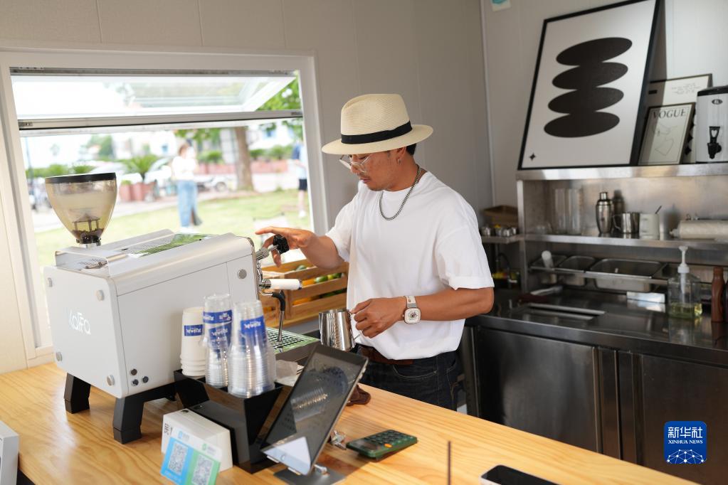 6月12日,在強蛟鎮一處海邊,“90后”創(chuàng )業(yè)青年馬真在自己經(jīng)營(yíng)的咖啡店為顧客制作咖啡。