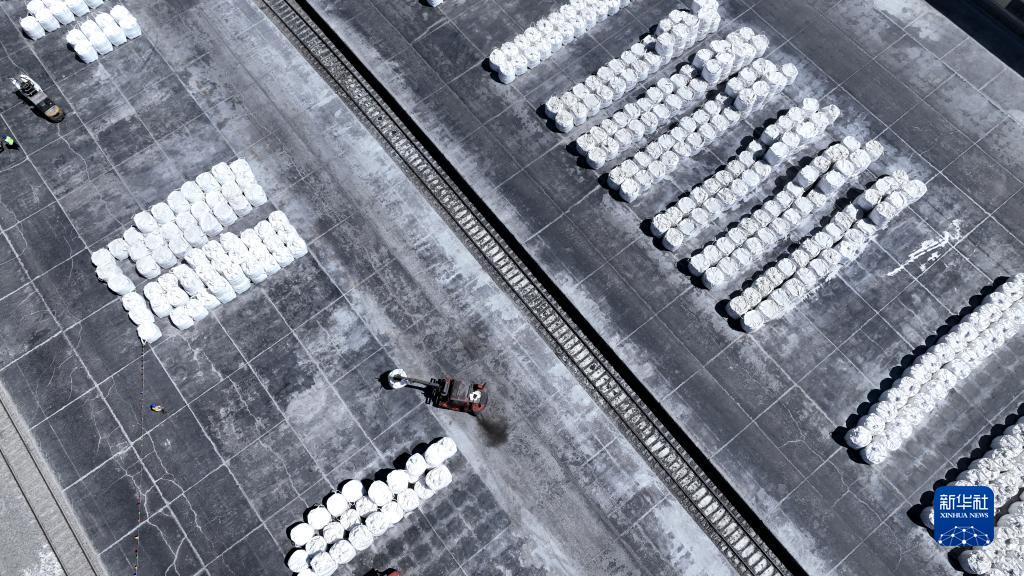 6月12日,在青海鹽湖工業(yè)股份有限公司鉀肥分公司貨場(chǎng),工作人員在裝運鉀肥(無(wú)人機照片)。