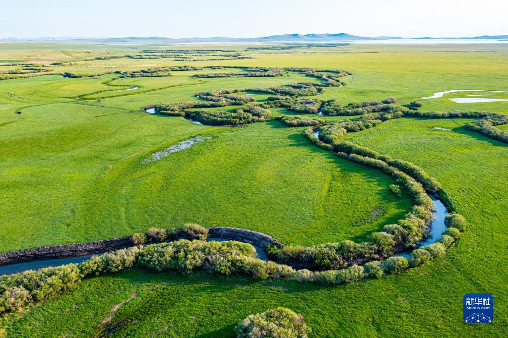 初夏時(shí)節,位于內蒙古自治區錫林郭勒盟東北部的烏拉蓋草原風(fēng)景宜人,蔚藍色的天幕下,綠色的草原廣闊無(wú)垠,蜿蜒流淌的烏拉蓋河綿延向遠方,美如畫(huà)卷。