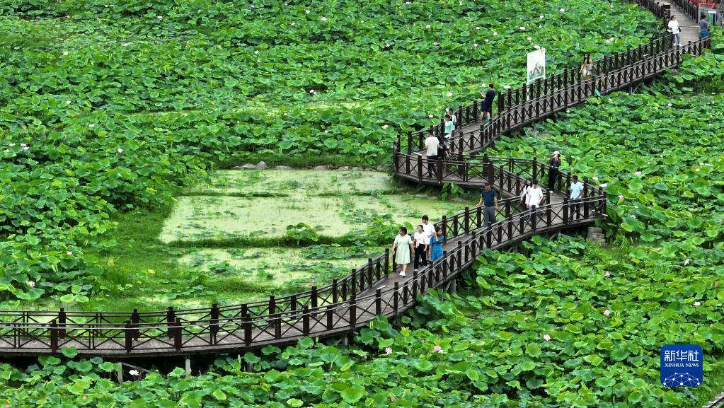 6月13日,游客在柳州市柳江區百朋鎮萬(wàn)畝荷塘里游覽(無(wú)人機照片)。