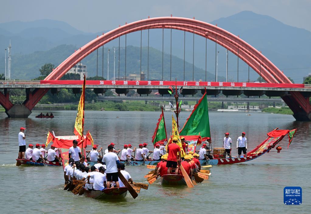 6月13日,龍舟在莆田仙游木蘭溪上行進(jìn)。