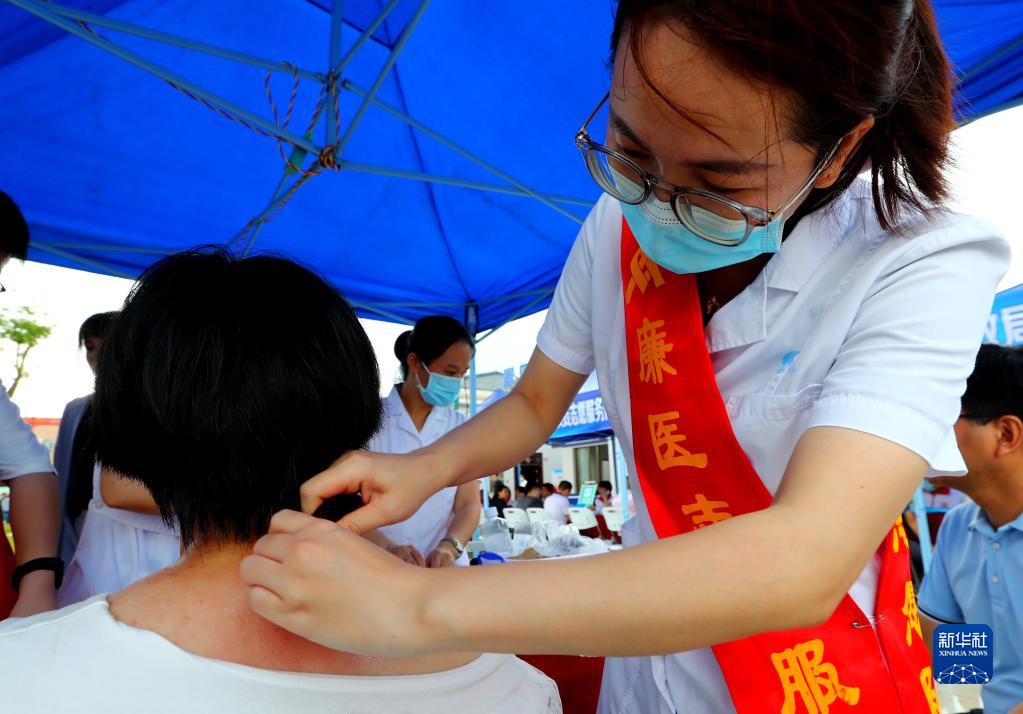6月13日,在廣東省廉江市“文明實(shí)踐大篷車(chē)”進(jìn)基層志愿服務(wù)活動(dòng)現場(chǎng),志愿醫務(wù)人員為基層群眾提供中醫服務(wù)。