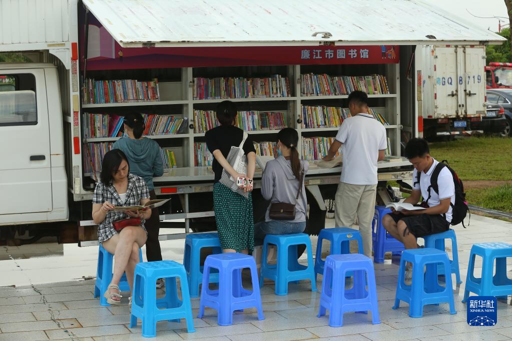 6月13日,人們在廣東省廉江市“文明實(shí)踐大篷車(chē)”進(jìn)基層志愿服務(wù)活動(dòng)現場(chǎng)的流動(dòng)圖書(shū)館前閱讀。