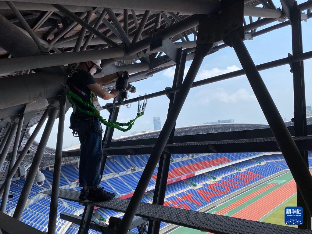 圖為新華社記者在東京奧運會(huì )橫濱賽場(chǎng)的馬道上安裝高點(diǎn)位遙控相機(2021年7月11日攝)。