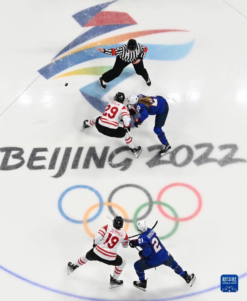 圖為加拿大隊和美國隊隊員在北京冬奧會(huì )女子冰球比賽中(2022年2月8日攝)。