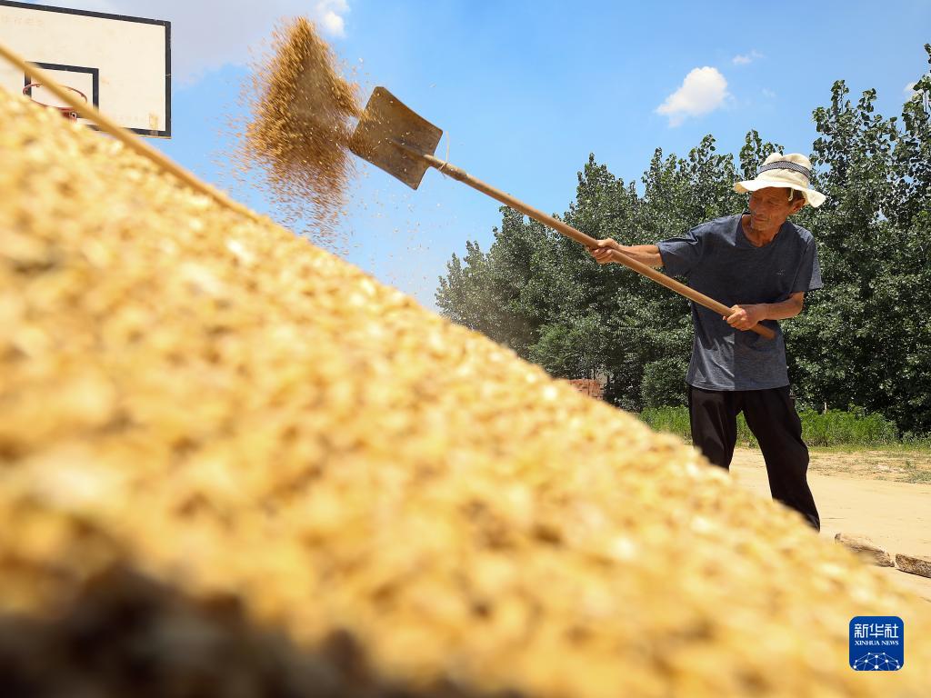 6月13日,在河南省安陽(yáng)市安陽(yáng)縣韓陵鎮西目村,村民在村籃球場(chǎng)臨時(shí)晾曬點(diǎn)翻曬麥子。