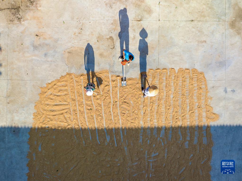 6月13日,在河南省安陽(yáng)市湯陰縣古賢鎮支村黨群服務(wù)中心臨時(shí)晾曬點(diǎn),村民在晾曬麥子(無(wú)人機照片)。