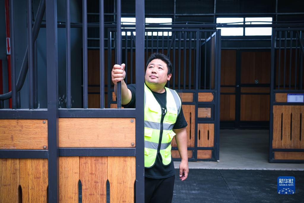 6月9日,在桐廬馬術(shù)中心,汪祥在巡查高標準馬廄時(shí)檢查移門(mén)。