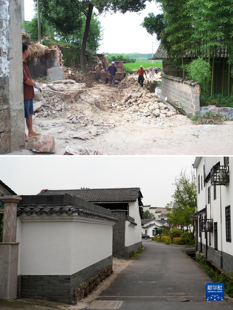 拼版照片:這是在同一地點(diǎn)拍攝的安吉縣鄣吳鎮鄣吳村景觀(guān)(上圖,王光法2000年攝;下圖,新華社記者韓傳號2023年6月13日攝)。