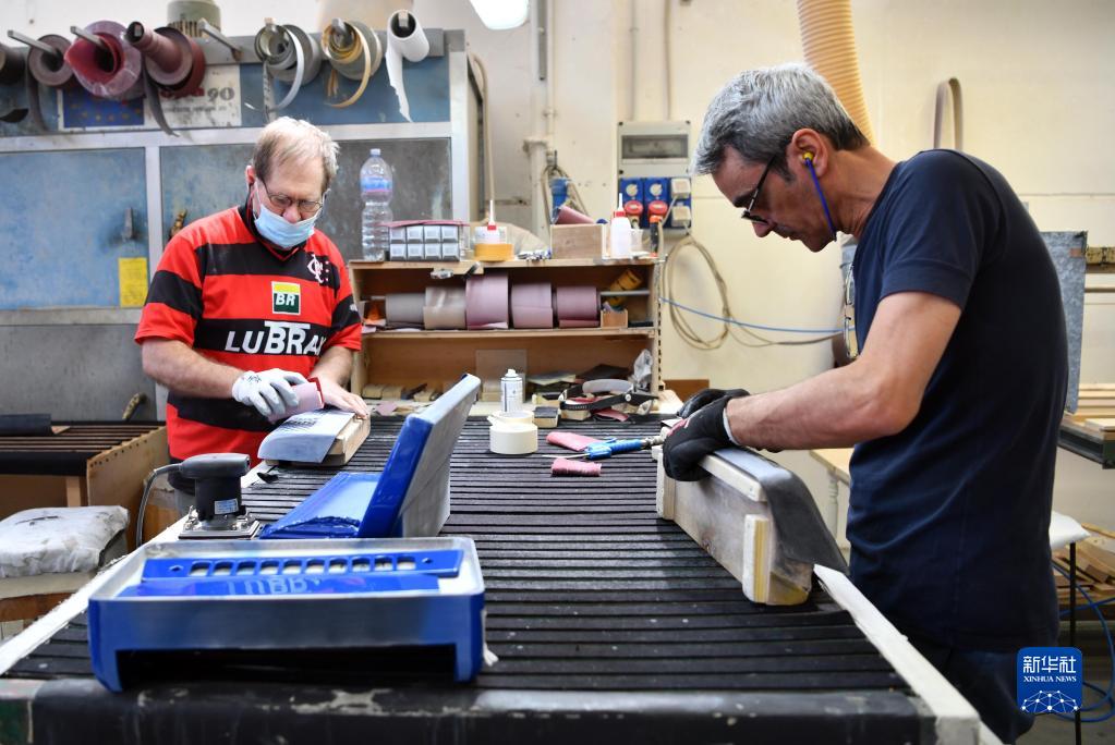 5月29日,在意大利卡斯特爾菲達多,貝爾杜納品牌手風(fēng)琴工匠打磨手風(fēng)琴部件。
