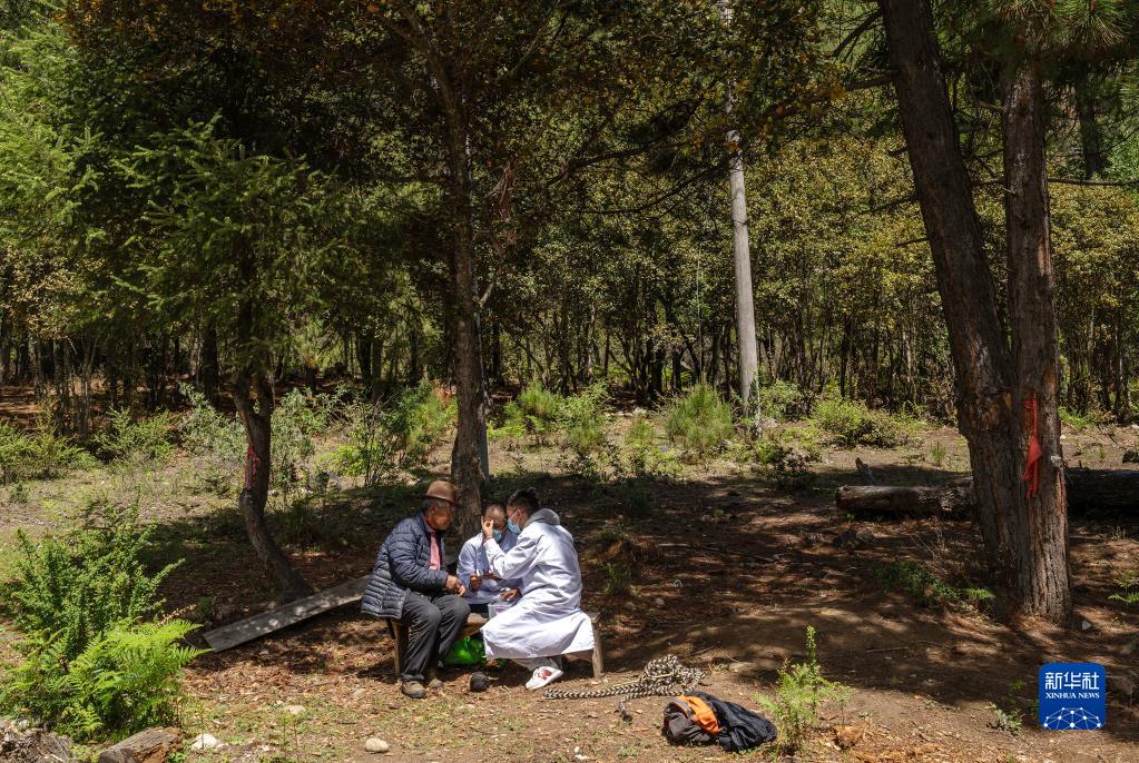 返程的途中,又有兩位老人攔住了汽車(chē),他們得知當天送醫上門(mén)的消息,便等候在離村幾公里的地方。于是,在路邊的樹(shù)下,王振疆醫生又帶著(zhù)尼瑪益西為兩位老人進(jìn)行了診療。