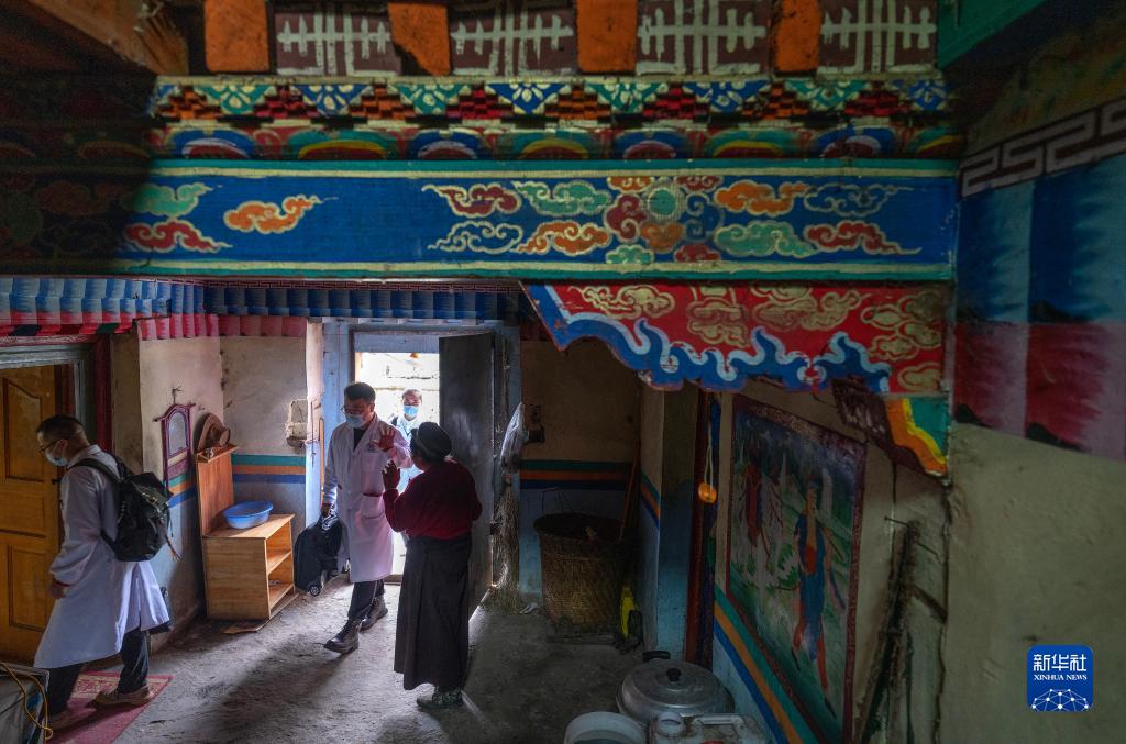 6月12日,王振疆(左一)、王彤旭(左二)和陳冰(左三)走進(jìn)64歲的次仁旺姆家中。她患有嚴重的類(lèi)風(fēng)濕性關(guān)節炎,關(guān)節變形,行動(dòng)不便。