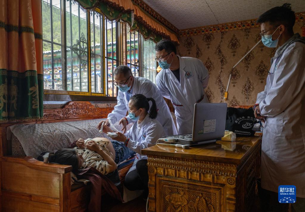 6月12日,王振疆(上左)、王彤旭(上中)和尼瑪益西(右一)協(xié)助陳冰(下右)為扎西央宗進(jìn)行產(chǎn)檢。