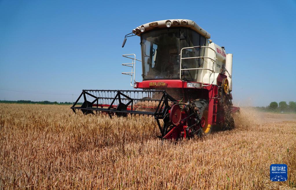6月14日,在山東省臨邑縣林子鎮,聯(lián)合收割機在收獲小麥。