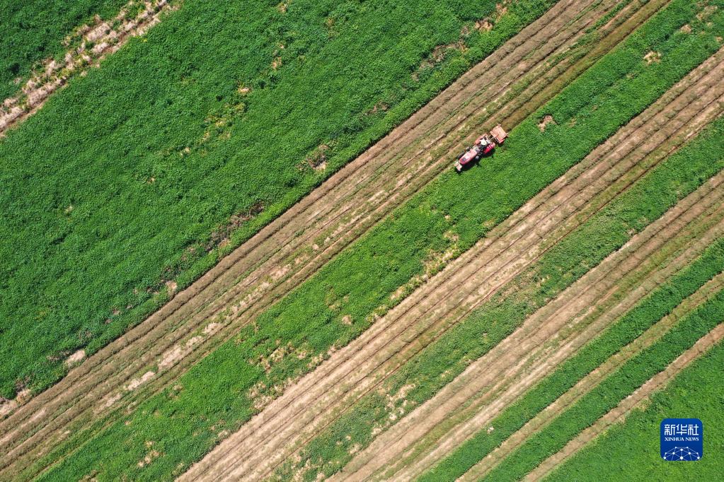 6月14日,在河北省滄州市吳橋縣安陵鎮,農民駕駛農機對馬鈴薯進(jìn)行殺秧(無(wú)人機照片)。