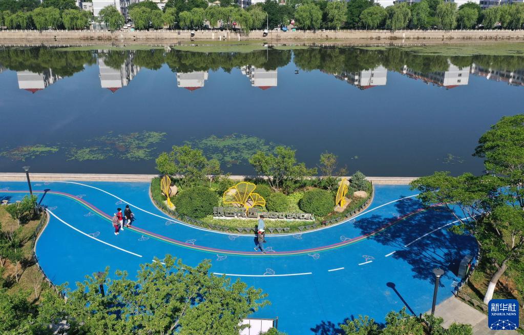 6月3日,市民從秦皇島市海港區綠廊綠道——健步主題公園內的可透水路面上走過(guò)(無(wú)人機照片)。