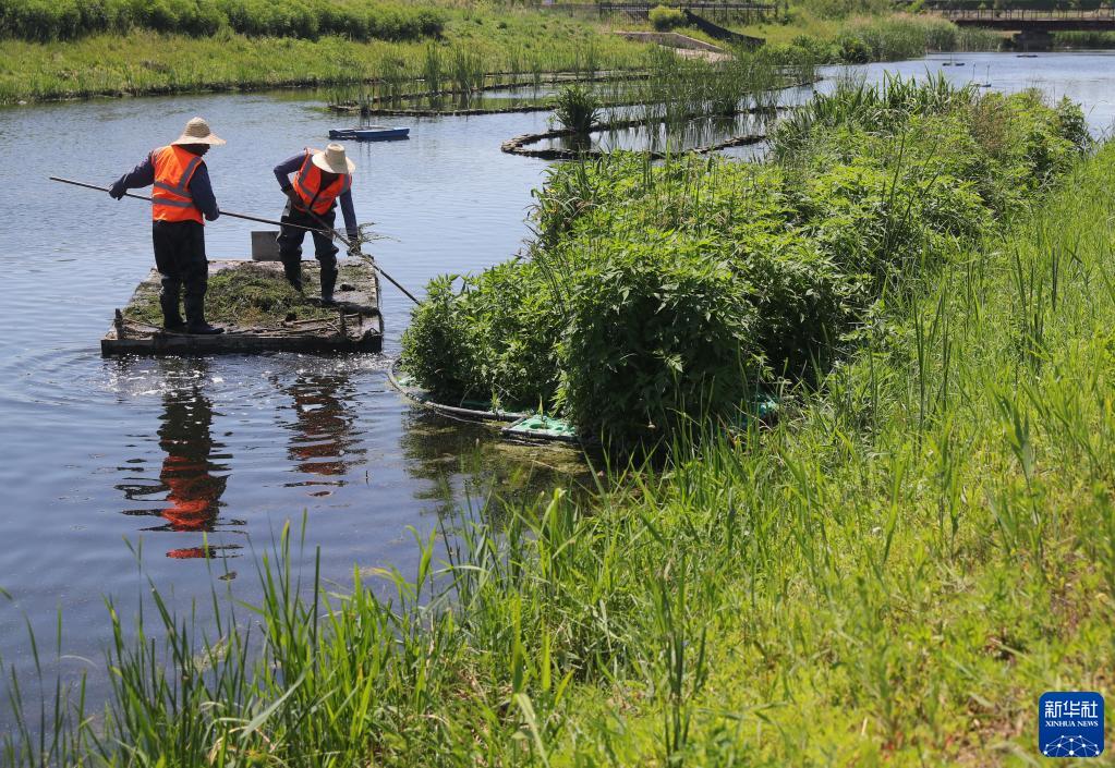 6月6日,環(huán)衛工人在秦皇島市海港區境內的排洪河清理水中雜物。
