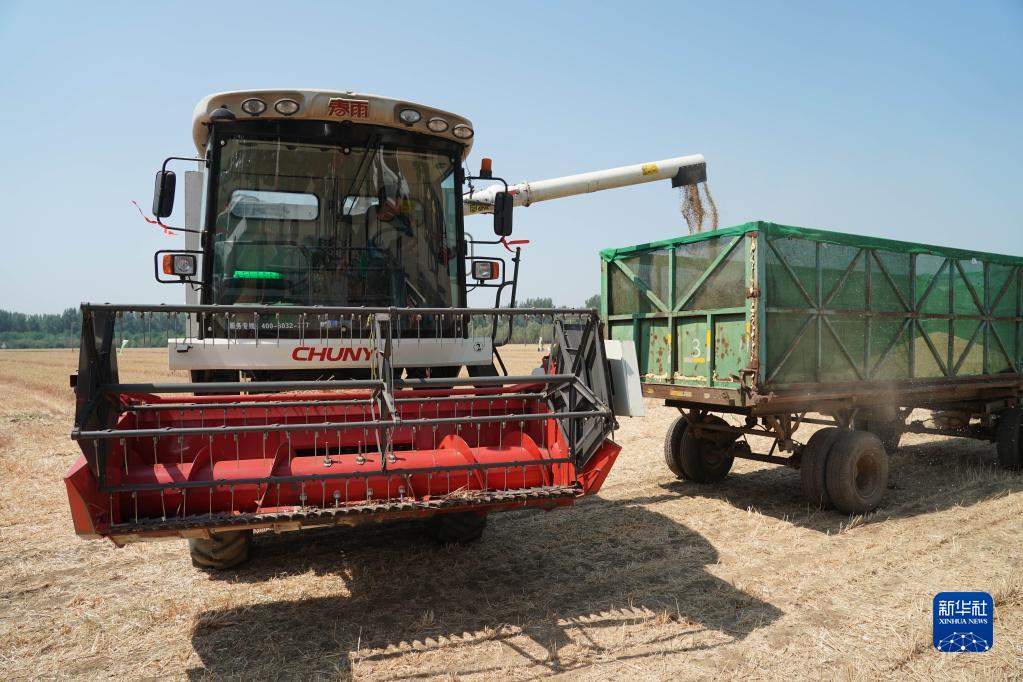 6月15日,在2023年北京市小麥機收減損技能大比武現場(chǎng),農機手操作收割機將收獲的小麥裝車(chē)。