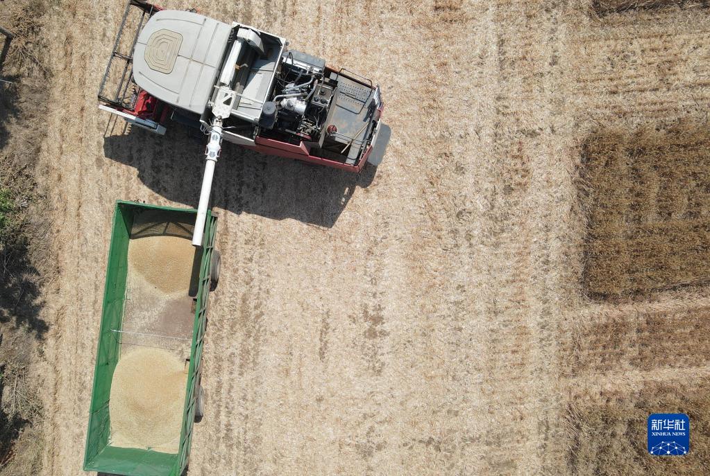 6月15日,在2023年北京市小麥機收減損技能大比武現場(chǎng),農機手操作收割機將收獲的小麥裝車(chē)(無(wú)人機照片)。