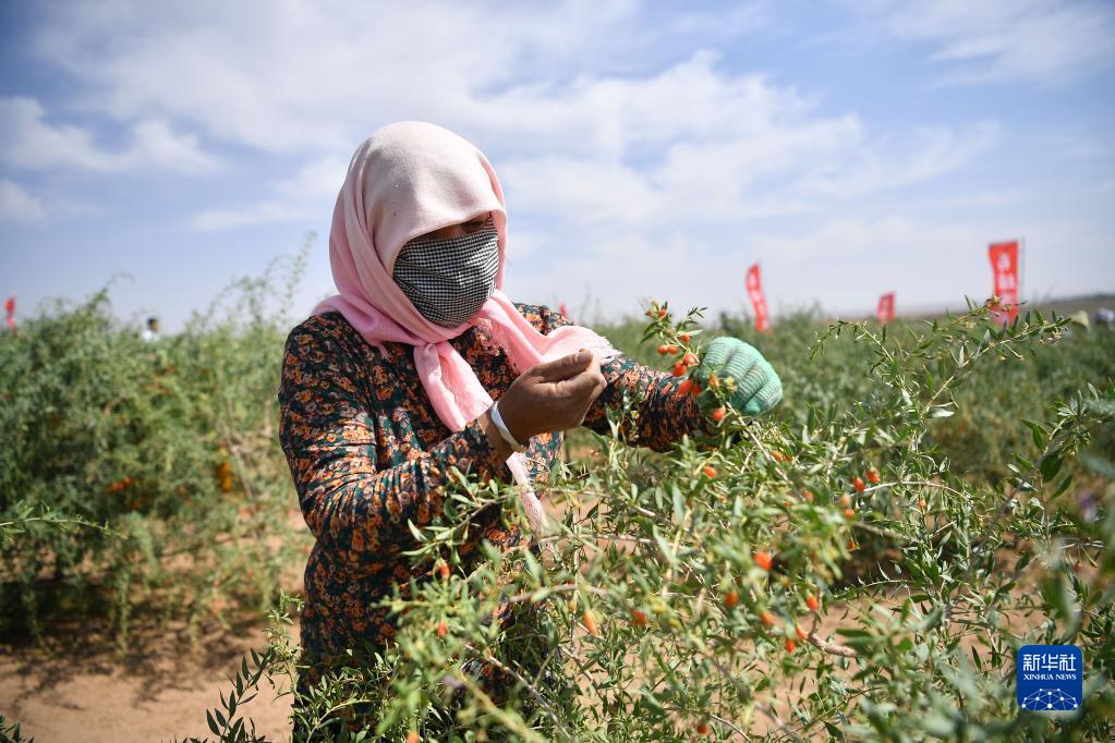 6月15日,采摘工在寧夏吳忠市紅寺堡區百瑞源枸杞種植基地采摘枸杞。
