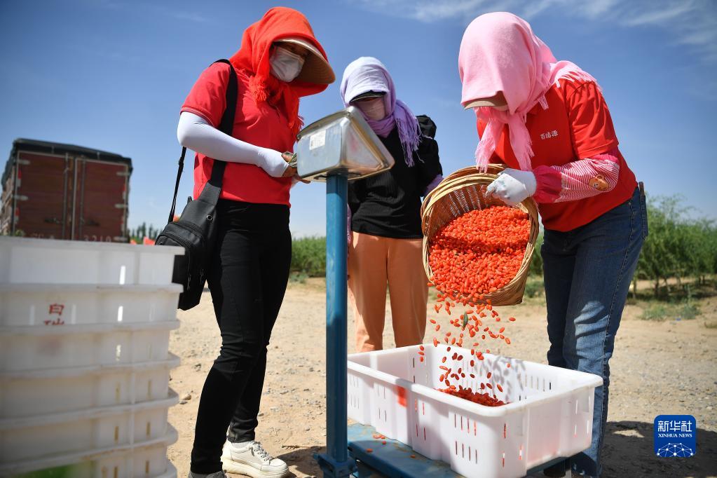6月15日,在寧夏吳忠市紅寺堡區百瑞源枸杞種植基地,采摘工將采摘的鮮枸杞稱(chēng)重。