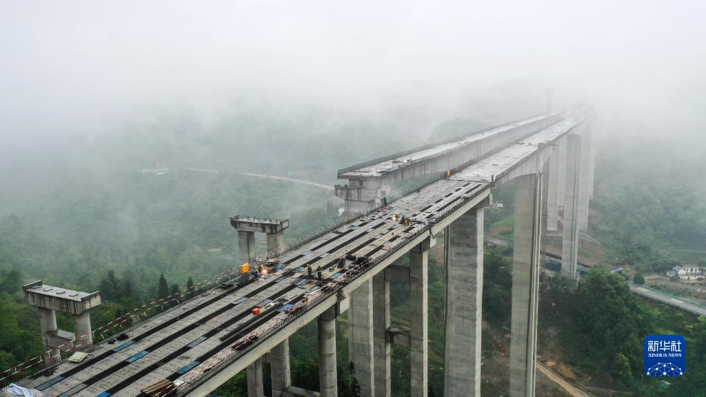 6月15日,貴州橋梁集團工人在六安高速3標段華竹山大橋上施工(無(wú)人機照片)。
