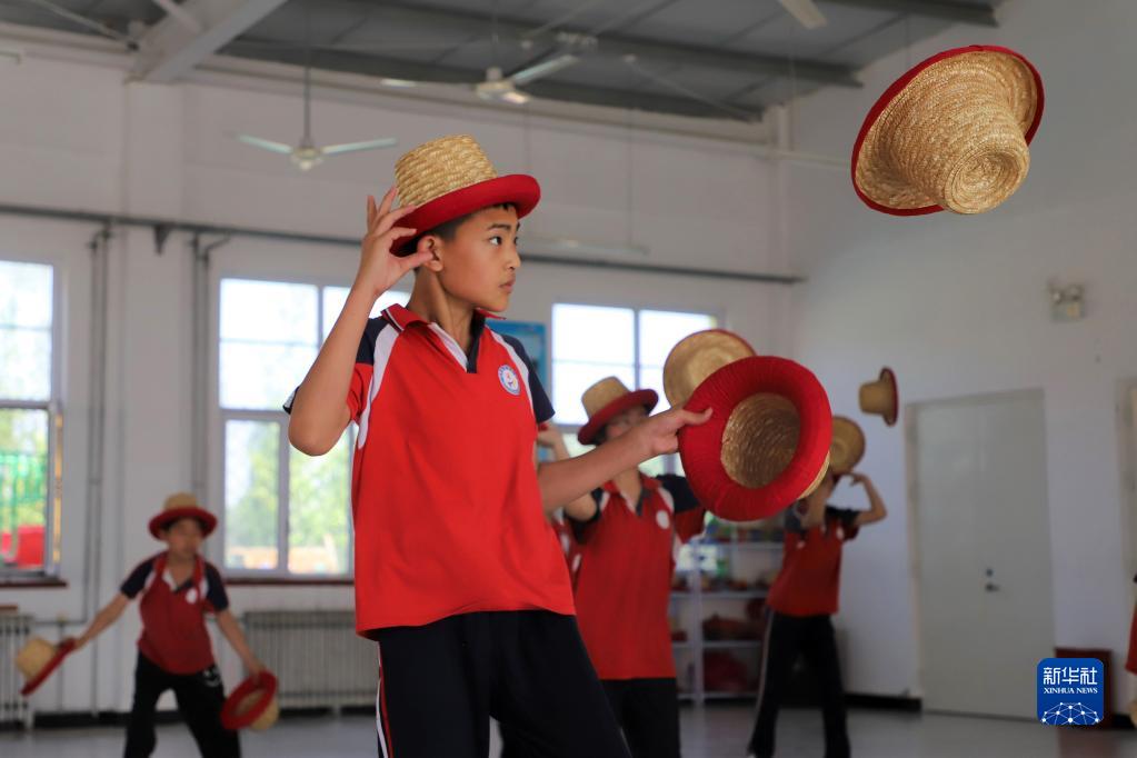 6月15日,在河北省滄州市吳橋縣馬庫吏小學(xué),學(xué)生練習雜技雜耍草帽。