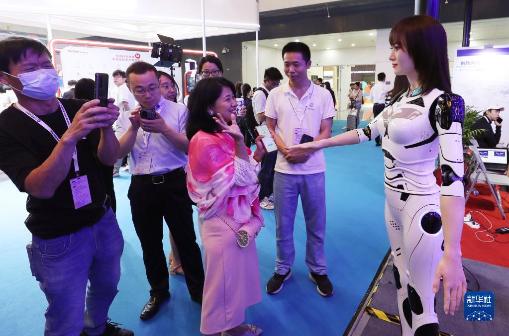 6月15日,參觀(guān)者在一款人形機器人前駐足觀(guān)看。