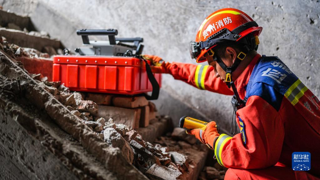 6月15日,六盤(pán)水市消防救援支隊隊員在使用生命探測儀進(jìn)行探測。
