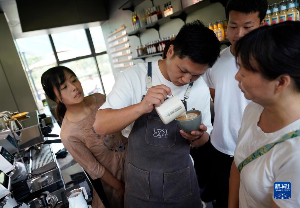 6月15日,在浙江省德清縣莫干山鎮仙潭美術(shù)館,民宿管家講師文軒(左二)為仙潭村民宿管家演示咖啡拉花。