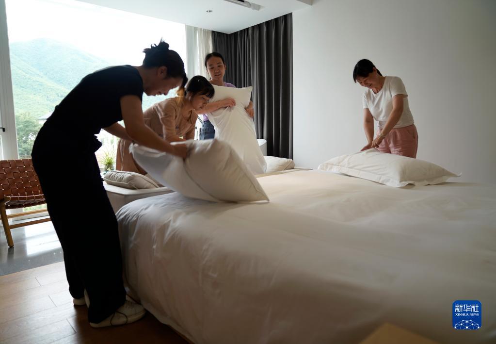 6月15日,在浙江省德清縣莫干山鎮仙潭村一家民宿內,民宿管家進(jìn)行房務(wù)訓練。