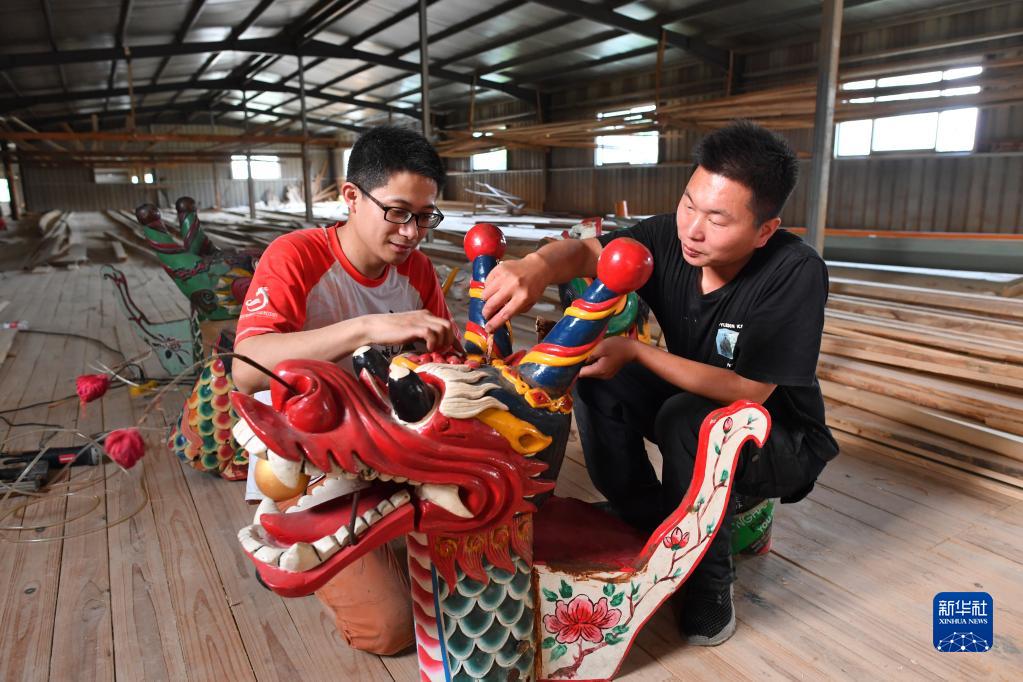 在福州市閩侯縣方莊村“龍舟世家”方忠雄龍舟廠(chǎng),方莊村新一代龍舟技藝傳承人方劍偉(左)在與畫(huà)師一起修復舊式龍頭(6月12日攝)。